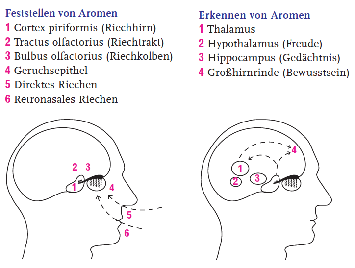 Um zu riechen, benutzt der Verkoster sowohl seine Nase als auch seinen Mund; man könnte sagen, dass sich der Gaumen in der Nase befindet, da sich die durch die Nase und auf retronasalen Weg wahrgenommenen Empfindungen bündeln und einander ergänzen. Der Geruchssinn ist der wichtigste Sinn bei der Wahrnehmung eines Weins, eines Kaffees oder eines Whiskys und verschafft 80 % des Genusses der Verkostung (denken Sie daran: wenn Sie erkältet sind, schmecken Sie nichts mehr!).