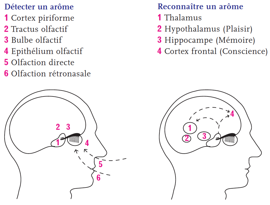 Pour sentir, le dégustateur utilise son nez et sa bouche ; on pourrait dire que le palais est dans le nez puisque les sensations perçues par le nez et par voie rétro-nasale se regroupent et se complètent. L’odorat constitue le plus important des sens dans la perception d’un vin, d’un café ou d’un whisky et procure 80% du plaisir de la dégustation (souvenez-vous qu’enrhumés, vous ne goûtez plus rien !).